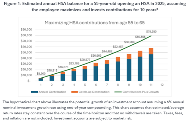 As illustrated below, let’s assume an employee maximizes contributions at the end of each year from age 55 to age 65. With investment growth beginning at age 56, at the 2025 individual contribution maximum of $4,300, plus the catch-up contribution of $1,000, that employee could have more than $75,000 in potentially federal income tax-free money to use on health care expenses by age 65 (based on an estimated 6% annual rate of return).